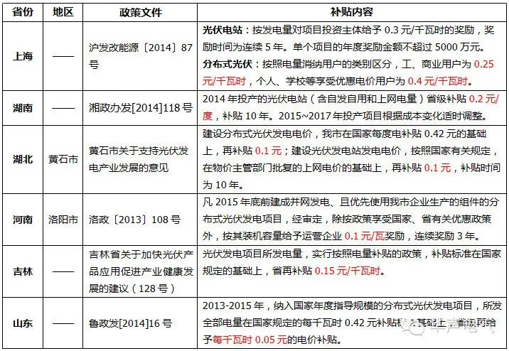 上海市、湖南省、湖北省、河南省、吉林省、山东省的光伏补贴如下表。