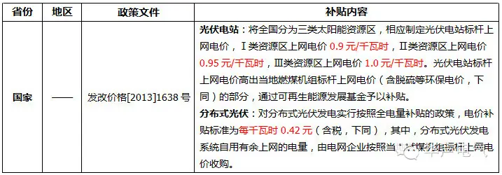 2013年8月,国家发改委发布《关于发挥价格杠杆作用促进光伏产业健康发展的通知》(发改价格[2013]1638号),明确分布式光伏发电项目的补贴标准为0.42元/千瓦(含税)。
