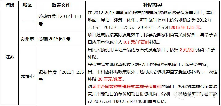 江苏光伏补贴政策最大的亮点无锡市是对光伏制造、EPC企业的支持,采用合同能源管理模式实施光伏电站项目的,一次性给予项目奖励。而苏州市政府5月6日才公布分布式光伏补贴政策,苏州市除享受国家和省有关补贴外,再给予项目应用单位或个人0.1元/千瓦时补贴,暂定补贴期限为三年。